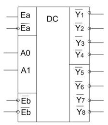 Досліджувана мікросхема К155ИД4 - два дешифраториякі приймаютьдвохрозрядний код адресу А1,А0(рис.3).Дешифратор DCА має два входи дозволу прямий Еа таінверсний Еа, а дешифратор DCВ тільки інверсні входи дозволу дешифрацііЕь. Якщо входи дозволу активні (для DCA Еа - висока напруга, Еа - низька напруга; для DCB EB1,EB2 - низька напруга), дешифратори DСA і DCB перетворюють двохрозрядний двійковий код, що поступає на входи AO A1в напругу низького логічного рівня, яка проявляється на відповідному виході Y DCAі DCB
