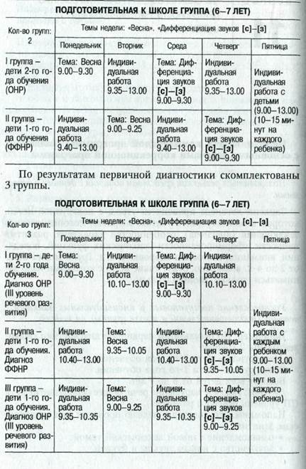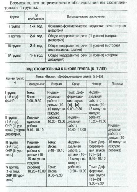 Цели и задачи комплексной программы совпадают с основными задачами коррекционной программы. Пользоваться регью как средством общения с детьми и взрослыми. Занятия логопеда проводятся утром с подгруппой детей, которая комплектуется с учетом возраста, логопедического заключения (диагноза), особенностей характера, развития личности, сформированности психических функций, поведения, внимания, состояния здоровья и т. д. Групп может быть от 2 до 4-х, возможно, будут такие дети, с которыми надо заниматься только индивидуально. Распределение подгрупповых и индивидуальных занятий с детьми (подготовительной к школе группы) на неделю. Например: По результатам первичной диагностики скомплектованы 2 группы: I подгруппа — дети 2-го года обучения; II подгруппа — дети 1-го года обучения. Возраст всех детей от 6 до 7 лет. Диагноз: Тяжелое нарушение речи, общее недоразвитие речи (III уровень речевого развития). Напомним, что логопед в неделю проводит два тематических занятия: • ознакомление с новой лексической темой; • знакомство с новым звуком и буквой.
