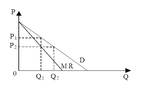 Крива попиту на продукт монополії є кривою ринкового попиту, яка має низхідний нахил. Тому монополіст може збільшити обсяг продажу, знижуючи ціну не тільки останньої, але й усіх попередніх одиниць продукції (рис. 9.1). Це означає, що граничний дохід (MR), який фірма-монополіст отримує від продажу додаткової одиниці продукції, завжди нижче її ціни (за винятком першої одиниці).