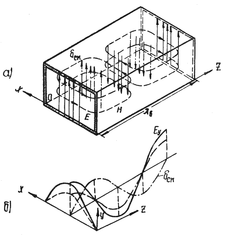 1. Электромагнитные поля Как показывает теория и практика в волноводах могут распространяться волны, в которых имеется продольная составляющая либо электрического, либо магнитного поля. Принято условно обозначать поперечную составляющую волны символом T и указывать тип поперечной составляющей - E (H). ¨ Поперечно-электрические (магнитные) волны, обозначаемые условно TE (символ T — обозначает поперечные, символ E — электрические), либо H — волны. ¨ Поперечно-магнитные (электрические) волны, обозначаемые условно TM либо E — волны. 2. Спектр типов волн в волноводе. Прежде чем перейти к данному вопросу поясним возможность передачи ЭМЭ по волноводу. Предположим, что имеется согласованная двухпроводная линия, питающаяся от генератора синусоидального напряжения. В такой линии возникают бегущие волны, переносящие ЭМЭ. Если подключить к линии параллельно четвертьволновые короткозамкнутые отрезки режим бегущих волн не изменится, поскольку входное сопротивление этих отрезков в точках их подключения к линии бесконечно большое. Очевидно, что таких изоляторов можно подключить к линии с обеих сторон сколь угодно много. В конечном счете, они сливаются друг с другом, образуя трубу прямоугольно сечения, то есть волновод, в котором распространяется бегущая ЭМВ рис.1.3.