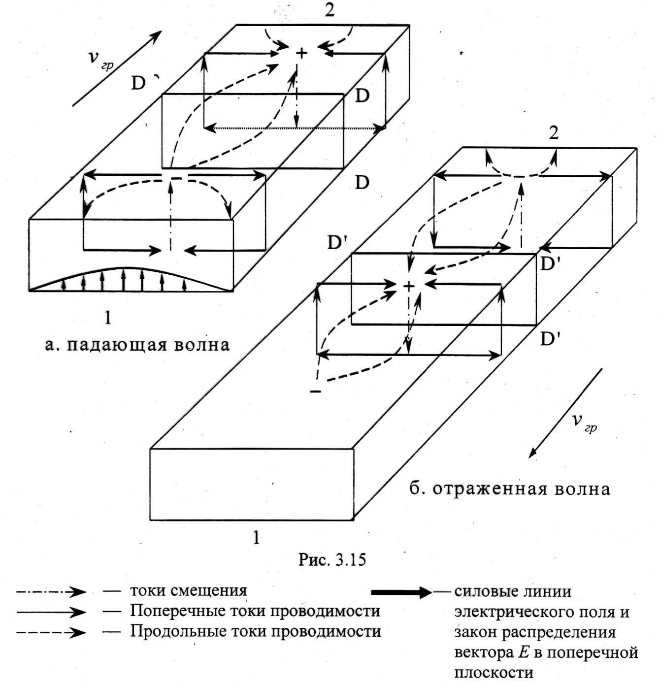 Волноводные ответвители служат для ответвления некоторой части мощности из основного тракта во вспомогательный. Ответвление в обычном ответвителе не зависит от направления распространения волны в основном тракте. Примером такого ответвителя является штырь, введенный в волновод. Направленным ответвителем (НО) называется устройство, позволяющее ответвлять из основного тракта раздельно мощность падающей и отраженной волн. НО состоит из двух взаимно перпендикулярных отрезков волновода, имеющих общую широкую стенку. Элементом связи является крестообразное отверстие, прорезанное в общей широкой стенке волноводов. Оно представляет собой две излучающие щели продольную и поперечную, которые для вспомогательного волновода являются возбуждающими источниками. Каждая щель возбуждает во вспомогательном волноводе волны, которые в одном плече вычитаются, а в другом – суммируются. Устройство ответвителя можно проследить на рис. 1.11. Если по основному волноводу энергия распространяется в направлении 1–2 (падающая волна), то часть этой энергии ответвляется в плечо 4. Если по основному волноводу энергия распространяется в направлении 2–1 (отраженная волна), то часть этой энергии ответвляется в плечо 3, где она поглощается нагрузкой. При обратном включении ответвителя в плечо 4 будет ответвляться энергия пропорциональная уровню мощности отраженной волны, а поглощаться нагрузкой будет часть энергии падающей волны. Докажем, что НО обладает направленными свойствами. На рис. 1.12 изображена падающая и отраженная волна с соответствующими им токами проводимости и смещения. На рис. 1.12, а изображена падающая