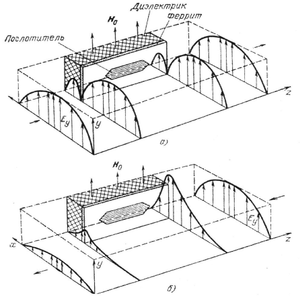 Рис.2.4. Устройство вентиля со смещением поля (а) и распространение в нём прямой и обратной волн (б) В вентиле со смещением поля на ферритовую пластину, расположенную у боковой стенки волновода, наносят пленку из поглощающего материала (рис. 2.4). Поясним принцип работы такого вентиля, считая, что в волноводе распространяются волны в прямом (вдоль координаты z) и обратном направлениях (направления распространения на рис. 2.4 указаны стрелками). Если протяженность постоянного магнитного поля