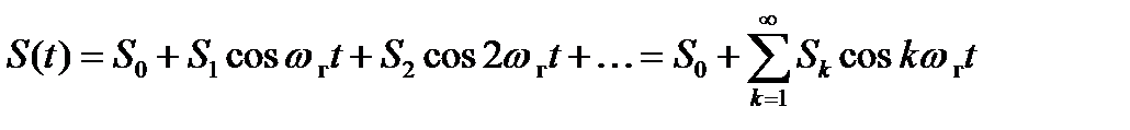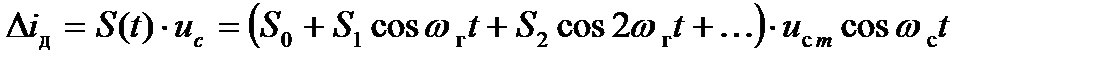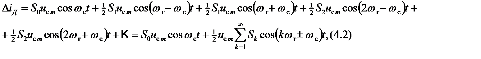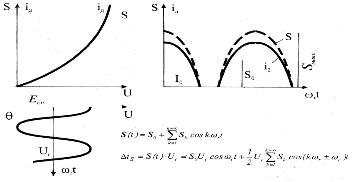 где S 0 – среднее значение крутизны S 1, S 2 – амплитуда первой, второй и т.д. гармоник крутизны Выходной ток нелинейного элемента (диода) меняется импульсами и в своем составе содержит колебания с частотой w г и гармониками 2 w г, 3 w г и т.д., которые способствуют образованию дополнительных каналов приема РПУ. 2. При подаче напряжения сигнала происходит приращение анодного тока i д на величину Учитывая, что