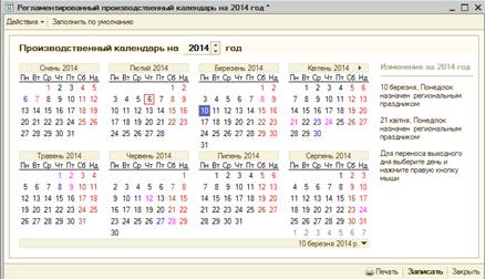 Завдання 5. Перед створенням графіків роботи необхідно провести корегування виробничого календаря. Для цього оберіть пункт СПРАВОЧНИКИ → ПРЕДПРИЯТИЕ → ПРОИЗВОДСТВЕННЫЙ КАЛЕНДАРЬ (рис. 8). Відкоригуйте виробничий календар згідно з потреб організації. Наприклад, кожен понеділок після того, як свято припадає на вихідний день, має бути вихідним, для 2014 року це 10 березня та 21 квітня (день після Пасхи). Використовуючи меню довідника: ДЕЙСТВИЯ → ПЕРЕНЕСТИ ВІХОДНОЙ ДЕНЬ перенесіть святкові дні, що випали на суботу та неділю на понеділки. Після цього необхідно