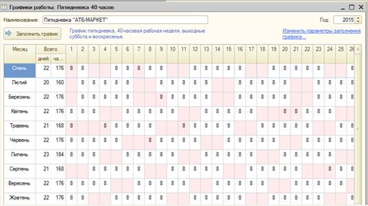Для обчислення місячного фонду заробітної плати використовуються призначені штатним одиницям графіки роботи. Довідник «Графики работы» містить перелік всіх графіків роботи підприємства і призначений для цілей обліку робочого часу за принципом відхилень. Графік зберігає в собі інформацію про обсяги робочого часу по днях і / або змінах. Параметри графіка задаються за допомогою «Помічника заповнення графіка», який відкривається з форми елемента довідника кнопкою Графік можна заповнити по одному із запропонованих шаблонів По шаблону можна створити наступні графіки: • Пятидневка 40 годин, • Шестидневка 40 годин, • Доба через дві, • Доба через троє, • Календарні дні. При створенні графіка по шаблону "Пятидневка 40 годин", або "Шестидневка 40 годин" враховуються святкові дні, в решті шаблонів святкові дні не враховуються. У разі використання шаблону можна потім відкоригувати заповнений графік вручну.