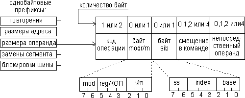 Приведенный на рис. 1 формат машинной команды является самым общим. Максимальная длина машинной команды — 15 байт. Реальная команда может содержать гораздо меньшее количество полей, вплоть до одного — только КОП.
