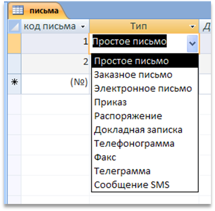 Рисунок 22 - поле, ссылающееся на другую таблицу и таблица - источник строк Список подстановки должен содержать все столбцы источника, позволяющие пользователю правильно выбрать нужные данные. Например, если в списке будут содержаться только коды типов документов, без их названий, то пользоваться таким списком будет крайне неудобно. Управление количеством и шириной отображаемых столбцов списка позволяет сделать подстановку более наглядной, не увеличивая размер файла БД. Например, список возможных типов документов содержится в таблице «ТипДокумента», в которой всего два столбца – ID_типа и его название. Пользователь может добавлять и изменять этот список. Таблица «Письма» с помощью поля «Тип» ссылается на первый столбец таблицы «ТипДокумента» (рисунок 22). На рисунке 23 показаны два способа описания ширины столбцов списка. В обоих случаях в таблицу «Письма» подставляется числовой код типа, но при нулевой ширине этого столбца пользователь видит только названия типов. Во втором случае пользователь видит в открытом списке как код, так и название, а в закрытом поле – только коды.