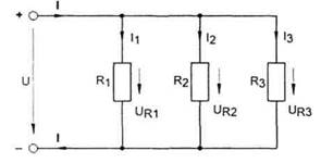Если резисторы или любые другие нагрузки соединены параллельно, все они находятся под одинаковым напряжением: U = UR1 = UR2 =UR3