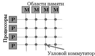Для построения мультипроцессорной системы с более чем 256 процессорами для соединения процессоров с памятью необходимы другие методы. Один из вариантов - разделить общую память на модули и связать их с процессорами через коммутирующую решетку.