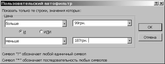 Мал. 36 Якщо у прихованому переліку вибрати пункт Условие …, то з’явиться вікно Пользовательский автофильтр (мал.36). У верхньому правому переліку слід вибрати один з операторів (равно, больше, меньше та ін.), а у полі праворуч вибрати одне зі значень. У нижньому правому переліку можна вибрати іншій оператор, і у полі ліворуч – значення. Коли увімкнений перемикач И, то будуть виводитися тільки записи, які задовольняють обидві умови. При увімкненому перемикачу ИЛИ будуть виводитися записи, які задовольняють одну з умов. Наприклад, у вікні на мал.36 введені умови для виведення записів по виробам з ціною більше 99грн і менше 187грн. Для виведення декількох записів з найбільшими або найменшими значенням по будь-якому полю слід у прихованому переліку поля вибрати пункт Первые 10. У діалоговому вікні Наложение условия по списку у першому полі з лічильником необхідно вибрати кількість записів, а у полі праворуч вибрати наибольших або наименьших. Щоб вивести усі дані переліку, необхідно викликати команду Отобразить все або скасувати команду Автофильтр меню Данные, підміню Фильтр.