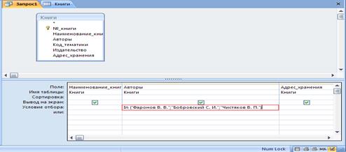 Пример использования специального оператора In. Пусть требуется отобрать книги нескольких авторов. Это можно сделать двумя способами: 1 способ