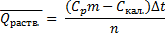 Где При термохимических расчетах для реакций, протекающих в растворах, надо учитывать тепловые эффекты (энтальпии) процессов растворения химических соединений в данном растворителе. Тепловой эффект (энтальпия) образования химического соединения в растворе, диссоциирующего в нем на ионы, определяется по теплотам (энтальпиям) образования ионов в растворе. Теплота растворения твердого соединения с ионной кристаллической решеткой определяется в основном суммой двух величин: теплоты разрушения кристаллической решетки и теплоты сольватации ионов молекулами растворителя. В связи с тем, что на разрушение кристалла теплота затрачивается, а процесс сольватации сопровождается выделением теплоты, знак теплоты растворения может оказаться как положительным, так и отрицательным в зависимости от того, какое из двух слагаемых больше по абсолютной величине. Прибавление воды к раствору также сопровождается тепловым эффектом - теплотой разведения. Чем разбавленнее раствор, тем теплота разведения меньше. Пользуясь интегральными теплотами растворения, можно вычислить теплоты разведения. Под интегральной теплотой растворения понимают теплоту растворения 1 моля вещества в бесконечно большом количестве растворителя. Если растворитель химически взаимодействует с растворяемым веществом или вещество, растворяясь, подвергается ионизации, то теплоты растворения таких веществ, указанные в справочниках, включают в себя теплоту сольватации (гидратации) или теплоту ионизации. При измерении теплоты растворения растворяют g г исследуемого вещества в G г растворителя и определяют при помощи термометра Бекмана изменение температуры. Расчет ведут по формуле: