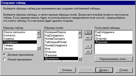 Рис. 4. Мастер создания таблиц 3. Проверить правильность отобранных полей и перейти на следующий этап формирования таблицы нажатием кнопки Далее. 4. Присвоить имя таблице Сотрудники и перейти к следующему этапу. Таблица 9 Состав полей в таблице Сотрудники