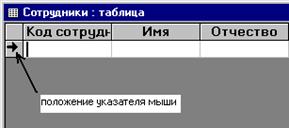 5. Перейти к следующему этапу, не выбирая новые связи!! 6. В окне Создание таблиц выбрать пункт Изменениеструктуры таблицы и нажать кнопку Готово. 7. Откроется вновь созданная таблица в режиме Конструктора, где следует переопределить свойства полей в соответствии с таблицей 9. Сохранить внесенные изменения. 8. Открыть таблицу Сотрудники. 9. При помощи программы Проводник открыть файл Сотрудники.doc, где находится информация о сотрудниках фирмы. Внимание!!! Выделить только содержимое таблицы Сотрудники в открывшемся документе (заголовки столбцов не выделять!!!). 10. Скопировать в буфер обмена выделенный фрагмент текста. Развернуть окно MS Access. 11. Подвести курсор к месту указателя записи, и после изменения вида курсора на черную стрелку, направленную в горизонтальном направлении, щелкнуть мышью (рис. 5). Выделится вся запись. 12. Выполнить команду Правка \ Вставить.
