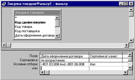 Рис. 11. Окно поиска записей 4. В списке Совпадение поставить значение Поляцеликом (в поле Образец должно быть набрано слово Оскол). 5. Начать поиск (Кнопка Найти). Появится сообщение о том, что записи не обнаружены. В списке совпадение поставить значение С любой частью поля, но установить флажок Только в текущем поле. Начать поиск (Кнопка Найти). Объяснить результаты поиска во всех трех случаях. Задание 4. Самостоятельно найти в таблице Продажи в поле Код товара запись со значением Кода товара 1020250. Распечатать запись (Файл \ Печать \ выделенные записи). Задание 5. Самостоятельно открыть таблицу Покупки и распечатать первую найденную запись, в которой Датой оформления договора было 15-е число любого месяца и года. Внимание!!! После выполнения каждого пункта задания отменять результат предыдущих действий! Задание 6. Организовать фильтрацию данных. Действия. 1. Открыть таблицу Заказчики. 2. Выполнить команду Записи \ Фильтр \ Изменить фильтр (или нажать на панели инструментов пиктограмму 3. Установить курсор на поле Город, раскрыть список и выбрать в нем значение Ст. Оскол. Нажать на пиктограмму 4. Результат фильтрации распечатать. 5. Нажать на кнопку 6. Установить курсор на одной из записей поля Город, имеющей значение Белгород. Нажать на пиктограмму 7. Отобразить все записи, нажатием кнопки 8. Закрыть таблицу Заказчики и открыть таблицу Покупки. Выполнить команду Записи \ Фильтр \ Изменить фильтр. В поле Дата оформления договора набрать >31.05.00, применить фильтр, отсортировать по возрастанию по полю Дата оформления договора и распечатать первые десять записей полученного списка. Отменить результат фильтрации. Задание 7. Применение расширенного фильтра. Расширенные фильтры применяются тогда, когда требуется найти записи, удовлетворяющие не одному, а нескольким критериям одновременно. Требуется выполнить фильтрацию данных по двум критериям сразу – найти все сделки купли товаров, выполненные на фирме за апрель и май 2000 года по товарам, на которых отсутствовал сертификат качества. Действия. 1. Открыть таблицу Покупки. 2. Выполнить команду Записи \ Фильтр \ Расширенный фильтр. В появившемся окне расширенного фильтра перетащить поля Дата оформления договора и Сертификат качества на бланк условий фильтрации (рис. 12). 3. В строке Условие отбора в столбце Дата оформления договора набрать >31.03.00 and <01.06.00. В столбце Сертификат качества установить значение Нет. 4. Применить фильтр. Полученный результат распечатать. Отменить результат фильтрации.