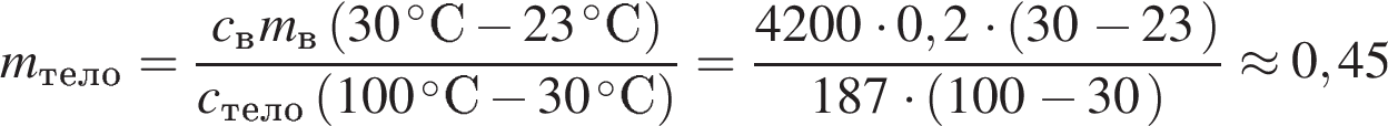 Ответ: 0,45 кг. 21. Задание 25 № 3451. Для определения удельной теплоемкости вещества тело массой 450 г, нагретое до температуры 100 °С, опустили в калориметр, содержащий 200 г воды. Начальная температура калориметра с водой 23 °С. После установления теплового равновесия температура тела и воды стала равна 30 °С. Определите удельную теплоемкость вещества исследуемого тела. Теплоемкостью калориметра пренебречь. Ответ приведите в Дж/(кг · К). Поскольку теплоемкостью калориметра можно пренебречь, все тепло, выделяющееся при остывании тела идет на нагрев воды. Составим уравнение теплового баланса: