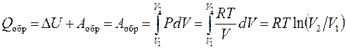 Если к термодинамической системе, состоящей из огромного числа частиц, подходить с позиции вероятностных законов, то представляется очевидным, что любой самопроизвольный процесс протекает в направлении, при котором система переходит из менее вероятного в более вероятное состояние. Этот вывод может служить одной из формулировок второго начала термодинамики. Покажем, что статистическая формула Больцмана S = R ×ln W, которая выражает энтропию через вероятность термодинамического состояния W,действительно соответствует определению энтропии через приведенную (т.е. деленную на температуру) теплоту d Q / T. Доказательство выполним для модели идеального газа, начав с вычисления теплоты, приобретенной системой при обратимом изотермическом (Δ U = 0, см. далее) расширении 1 моля идеального газа.