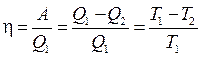 Очевидно, что чем больше объем V, тем больше вероятность нахождения в нем рассматриваемого моля газа. Заменяя отношение V 2/ V 1 равным ему W 2/ W 1 и сопоставляя деленное на Т соотношение (3.4) с вытекающим из формулы Больцмана изменением энтропии D S = S 2 – S 1 = R ×ln(W 2/ W 1), получаем D S = Q обр/ T, которое соответствует определению (3.3). Далее, не сложно показать, что найденная работа обратимого изотермического расширения (3.4) всегда больше работы соответствующего необратимого процесса А необр = P (V 2 – V 1) = RT (V 2 – V 1)/ V 2 = RT (1 – V 1/ V 2), (3.5) когда отпущенный при объёме V 1 поршень первоначально сжатого в цилиндре газа в условиях постоянного внешнего давления P (возможно после нескольких колебаний) остановится в положении с объёмом V 2. Неравенство вычисленных работ А обр > А необр для рассмотренного идеального газа в изотермическом (Δ U = 0) процессе с учетом первого закона термодинамики приводит к неравенству Q обр > Q необр. Его деление на T дает неравенство Δ S > Q необр / T, (3.6) которое обосновывает принципиальную часть второго начала термодинамики (3.3'). Второе начало термодинамики исключает возможность создания вечного двигателя второго рода, т.е. устройства, в котором при помощи кругового процесса охлаждается источник тепла, причем все количество теплоты превращается в механическую работу. Возможно лишь частичное превращение теплоты в работу (в противоположность обратному процессу). Коэффициент полезного действия процесса, в котором происходит превращение теплоты в работу: Q 1и Q 2 – количества теплоты отданное нагревателем и поглощенное холодильником, находящимся, соответственно, при температуре Т 1и Т 2. Второе равенство в (3.7) справедливо для полностью обратимых процессов (например, для цикла Карно). Все естественные процессы (например, в тепловых машинах) протекают с меньшим коэффициентом полезного действия. Дифференциальная форма соотношения (3.6) после подстановки в него (3.2) объединяет 1-ое и 2-ое начала термодинамики: TdS > dU + PdV + δ A необр. При этом в совершаемой системой общей работе по всем ее видам выделена работа расширения PdV. В окончательной форме основного термодинамического соотношения TdS ≥ dU + PdV + δ A (3.8) знак равенства относится к обратимым процессам, а знак неравенства - к необратимым. В изолированной системе (dU = 0, dV = 0,δ A= 0), т. е. при фиксированных U и V, как следует из (3.8), могут протекать процессы только с возрастанием энтропии: (dS) U,V ≥ 0 (3.9) В результате такого самопроизвольного процесса при рассматриваемых условиях (U, V = const) система приходит в состояние равновесия, а её энтропия достигает максимального значения. Соответствующие критерии равновесия в математической форме имеют вид: (dS) U,V = 0, (d 2 S) U,V < 0. (3.10) 3. 2. Характеристические функции Совершаемая системой работа А, при её выражении из основного термодинамического соотношения (3.8) δ A ≤ TdS - dU - PdV (3.11) будет максимальной при обратимом процессе (знак равенства в (3.11)). Например, максимальную полезную работу в химической реакции можно получить, если проводить её в обратимом гальваническом элементе. Величина полезной работы будет зависеть от условий протекания реакции. 3.2.1. В самопроизвольном процессе при условии постоянства S, V (dS =0, dV =0),согласно (3.11), δ A ≤ - (dU) S , V. Максимальная полезная работа равна убыли внутренней энергии системы U: (A обр) S , V = - (Δ U) S , V = - (U 2 – U 1) S , V (3.12) Внутренняя энергия как характеристиче