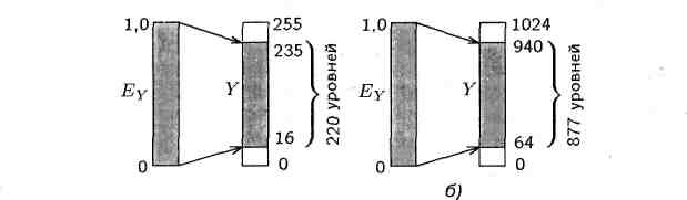 и десятиразрядной шкалы. В восьмиразрядной шкале сигналу отводится 220 уровней квантования (с 16 -го, соответствующего уровню черного, по 235 -й,