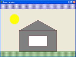 Поставим на форму компонент PaintBox. Опишем процедуру на событие OnPaint этого компонента. procedure TForm1.PaintBox1Paint(Sender: TObject); var x,y:integer; with PaintBox1.Canvas do brush.Color:=clRed; ellipse(0,0, PaintBox1.width, PaintBox1.height); font.Name:='arial'; font.Size:=height div 5; font.Style:=[fsBold,fsItalic]; font.Color:=clwhite; x:=(PaintBox1.width-textwidth('Delphi')) div 2; y:=(PaintBox1.height-textheight('D'))div 2; textout(x,y,'Delphi'); end; end; Рассмотрим пример рисования на поверхности формы с использованием свойства Canvas. Выполним вывод изображения домика.