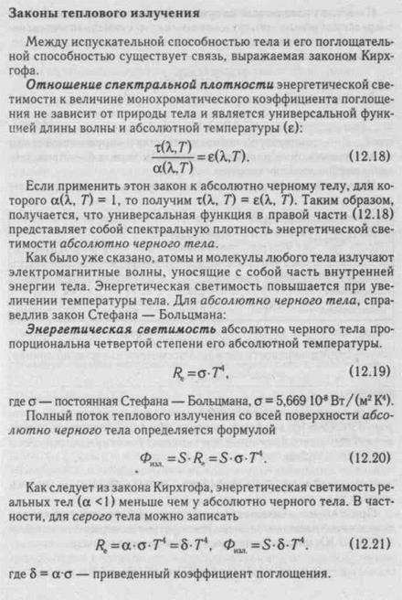 Еще один способ теплообмена между телом и окружающей средой состоит в испускании и поглощении электромагнитных волн. Тепловое излучение — электромагнитное излучение, испускаемое веществом и возникающее за счет его внутренней энергии. Тепловое излучение обусловливается возбуждением частиц вещества при соударениях в процессе теплового движения или ускоренным движением зарядов (колебания ионов кристаллической решетки, тепловое движение свободных электронов и т. д.). Оно возникает при любых температурах и потому присуще всем телам. И поток излучения, и энергетическая светимость зависят от строения вещества и его температуры: Ф = Ф(Т), Re = Re(T). Энергетическая светимость /?е, определенная выше, охватывает весь диапазон длин испускаемых волн (теоретически — от нуля до бесконечности). Для того, чтобы показать, как излучаемая энергия распределена по этому диапазону, используют специальную величину, называемую спектральной плотностью энергетической светимости. Обозначим энергию теплового излучения, испускаемую единичной поверхностью тела за 1 с в узком интервале длин волн от X до X+dX через dRe. Спектральной плотностью энергетической светимости (х) (испускательной способностью) называется отношение энергетической светимости в узком участке спектра (dRe) к ширине этого участка (dX):