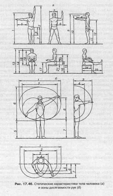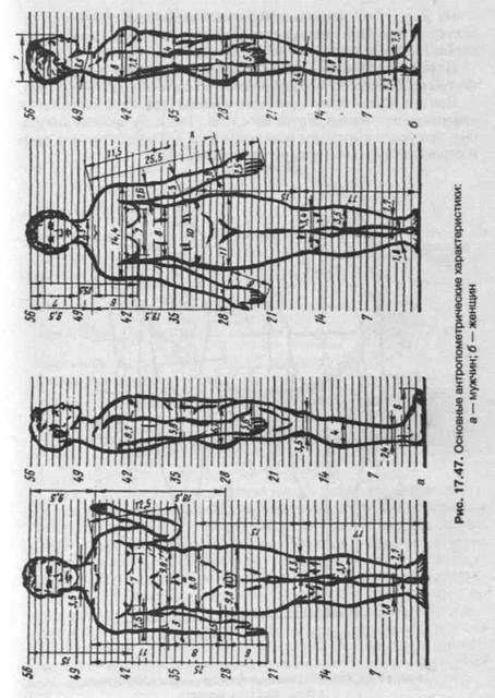 На рис. 17.47 показаны основные антропометрические характеристики. Ими пользуются, например, для определения длин сегментов после двусторонней ампутации конечностей.