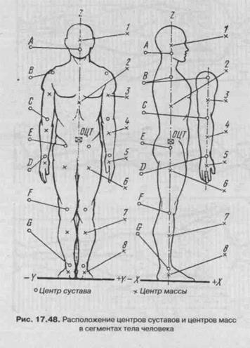 На рис. 17.48 буквами обозначены центры суставов, а цифрами — центры масс соответствующих сегментов тела человека (табл. 17.12).
