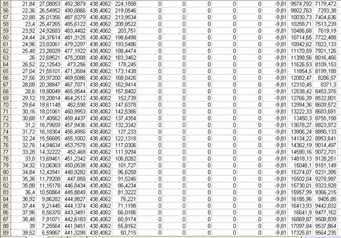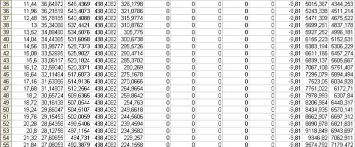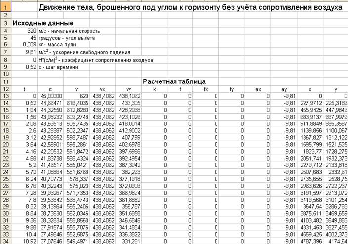 (Учтено то, что направление силы противоположно скорости.) Используем табличную схему модели в электронных таблицах. В ячейку В1 введем название "Движение тела, брошенного под углом к горизонту, с учетом сопротивления воздуха". Исходными данными для поставленной задачи являются начальная скорость, угол выстрела, масса пули, ускорение свободного падения, коэффициент сопротивления воздуха и шаг времени. В раздел "Исходные данные" внесем: А4: 620 В4: "м/с – начальная скорость" А5: 45 В5: "градусов – угол выстрела" А6: 0,009 В6: "кг – масса пули" А7: 9,81 В7: "м/с2 – ускорение свободного падения" А8: 0 В8: "Н*(с/м)2 – коэффициент сопротивления воздуха" А9: 0,52 В9: "с – шаг времени" В раздел "Расчетная таблица" в строку 12 внесем по порядку буквы, обозначающие физические величины: t, α, v, vx, vy, k, F, Fx, Fy, ax, av, x, y. В строку 13 вносим следующие формулы: А13: 0 В13: =А5 С13: =А4 D13: =С13*СОS(В13*ПИ()/180) Е13: =C13*SIN(B13*IIИ()/180) F13: =А8 G13: =F13*C13^2 Н13: =G13*COS((B13+180)*ПИ()/180) I13: =G13*SIN((B13+180)* ПИ ()/180) J13: =H13/$A$6 K13: =I13/$A$6-$A$7 L13: 0 M13: 0 В строку 14 вносим формулы: А14: =А13+$А$9 В14: =АТАN (Е14/D14)*180/ПИ() С14: =КОРЕНЬ(D13^2+Е14^2) D14: =D13+J13*$A$9 Е14: =Е13+К13*$А$9 F14: =F13 G14: =F14*C14^2 Н14: =G14*COS((B14+180)* ПИ ()/180) I14: =G14*SIN((B14+180)* ПИ ()/180) J14: =H14/$A$6 K14: =I14/$A$6-$A$7 L14: =L13+D14*$A$9 M14: =M13+E14*$A$9 Остальные строки расчетной таблицы (до 190-й строки) заполняются вниз блоком А14:М14. Бланк электронной таблицы будет иметь вид:
