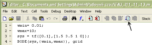 Для детального исследования САУ представим её в виде структурной схемы, изображенной на рис. 1, в соответствии с которым передаточная функция (1) является последовательным соединением отдельных звеньев: 1) интегрирующего усилителя с форсирующим звеном 2) инерционно-форсирующего звена 3) интегрирующего звена Рис.1. Структурная схема САУ Для решения указанных задач запускаем MatLab кликом правой кнопки (ПК) мыши по соответствующему ярлыку. 1. Создаем m-файл, для чего в левом верхнем окне инструментальной панели пакета MATLAB нажимаем File, New или нажимаем окно 2. В открывшемся окне Editor создаем файл, позволяющий получить следующие передаточные функции: - передаточную функцию разомкнутой системы - передаточную функцию по ошибке - передаточную функцию замкнутой системы С указанной целью записываем следующую программу и обязательно сохраняем её любым именем на английском языке: 1. %ВАРИАНТ №___(если строка содержит знак %, вся информация, % следующая за ним программой игнорируется) 2. W1=tf(20*[1 1],[1 0]) % в квадратных скобках записываются коэффициенты числителя и знаменателя, начиная со старшей степени s 3. W2=tf([1 1],[10 1]) 4. W3=tf(1,[1 0]) % Для проверки правильности набора в конце строк 2,3,4 не ставим ";". % При этом будет распечатка введенных функций. % Если ошибок нет, продолжаем набирать программу. 5. W12=W1*W2 6. Wge=1/(1+W12*W3)!!!! 7. Wgy=feedback(W12*W3,tf(1,1)) Результат работы программы (выделен жирным шрифтом) при построчном введении команд (цифры в начале каждой строки не вносятся) имеет следующий вид: >> W1=tf(20*[1 1],[1 0]) Transfer function: 20 s + 20 --------- s >> W2=tf([1 1],[10 1]) Transfer function: s + 1 -------- 10 s + 1 >> W3=tf(1,[1 0]) Transfer function: - s >> W12=W1*W2 Transfer function: 20 s^2 + 40 s + 20 ------------------ 10 s^2 + s >> W=W12*W3 Transfer function: 20 s^2 + 40 s + 20 ------------------ % W – перед. Ф-я РАЗОМКНУТОЙ СИСТЕМЫ 10 s^3 + s^2 >> Wge= feedback(1/ W,tf(1,1)) Transfer function: 10 s^3 + s^2 --------------------------- 10 s^3 + 21 s^2 + 40 s + 20 >> Wgy= feedback(W,tf(1,1)) Transfer function: 20 s^2 + 40 s + 20 --------------------------- 10 s^3 + 21 s^2 + 40 s + 20 В передаточных функциях Wge и Wgy использованы выражения feedback и tf(1,1), которые подразумевают использование в САУ главной единичной обратной связи. При запуске записанной в Editor программы нажатием ПК на её инструментальной панели окна (показано стрелкой)
