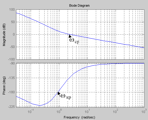 в том же диапазоне частот. Можно изменить диапазон частот, указав его как {ωmin,ωmax}. Например, для рассматриваемой САУ функция Bode (W,{0.03,1000}), grid on % дает рис. 3 На этом рисунке нанесены две частоты: - ωср – частота, на которой модуль (2) равен 1. Она называется частотой среза, т.к. до неё, т.е. при изменении 0≤ω<ωср модуль больше 1, при ωср<ω≤∞ модуль меньше 1 (соответственно lg(A (ω)) отрицательный, что видно из графиков рис. 2, 3): - ωкр – частота, при которой фаза (3) равна -180о. Она называется частотой критической.