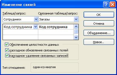 25. Флажки Каскадное обновление связанных полей и Каскадное удаление связанных записей обеспечивают одновременное обновление или удаление дан- ных во всех подчиненных таблицах при их изменении в главной таблице. 26. Параметры связи можно изменить, нажав на кнопку Объединение. 27. После установления всех необходимых параметров нажмите кнопку ОК.