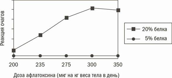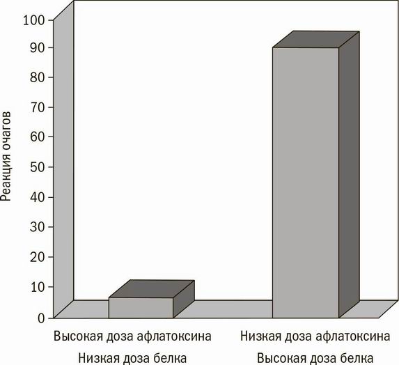 Рис. 3.8. Взаимосвязь дозы афлатоксина и реакции очагов