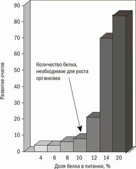 Исходя из рекомендуемой дневной нормы потребления, людям следует получать около 10 % энергии из белка. Для этого требуется гораздо больше белка, чем жизненно необходимо. Однако поскольку эта норма может быть различной у людей, диета, на 10 % состоящая из белка, рекомендуется для того, чтобы обеспечить должное его потребление практически для всех. Какое количество белка мы обычно употребляем в пищу? Интересно, что это гораздо больше рекомендованных 10 %. Увеличивает ли это риск возникновения раковых заболеваний? Описанные опыты на животных позволяют положительно ответить на этот вопрос. Доля белка в рационе, равная 10 %, соответствует потреблению 50–60 г белка в день в зависимости от массы тела и общего количества поглощаемых калорий. Например, в 100 ккал шпината (425 г) содержится примерно 12 г белка, а в 100 ккал сырого нута (это всего лишь чуть более двух столовых ложек) – 5 г белка. В 100 ккал филейного бифштекса (немногим более 42,5 г) содержится около 13 г белка. Еще один вопрос был связан с тем, может ли прием белка изменить крайне важную взаимосвязь между дозой афлатоксина и формированием очагов. Химическое вещество обычно не считается канцерогеном, если повышение его дозы не ведет к увеличению риска заболеваемости раком. Так, при повышении дозы афлатоксина рост очагов и опухоли также должен ускоряться. Если для химического вещества, предположительно являющегося канцерогеном, такая закономерность не наблюдается, возникают серьезные сомнения в его канцерогенности. Для исследования этой взаимосвязи между принимаемой дозой и реакцией организма 10 группам крыс давали все возрастающую дозу афлатоксина, и при этом на стадии промоции их кормили пищей, содержащей либо обычную (20 %), либо пониженную (5–10 %) долю белка (рис. 3.834).