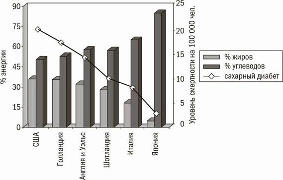 Как и большинство хронических болезней, в одних регионах мира сахарный диабет встречается чаще, чем в других. Это было известно сотни лет. Кроме того, было зафиксировано, что население стран, где сахарный диабет встречается реже, питается иначе, нежели жители стран с более высокой частотой возникновения этого заболевания. Это лишь совпадение или тому есть причины? Почти 70 лет назад Гарольд Химсворт объединил все существующие исследования в отчет, в котором проводилось сравнение питания и частоты возникновения сахарного диабета в шести странах. Он обнаружил, что в одних культурах еда богата жирами, а в других – углеводами. Это объяснялось тем, что в одних странах население питалось преимущественно животной пищей, а в других – растительной. На рис. 7.1 отображены данные по питанию и болезни для этих стран в начале XX в.5