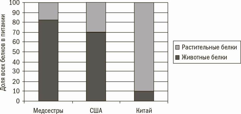 К сожалению, акцент лишь на жирах вводил в заблуждение. В исследовании Кэрролла, как и во всех прочих международных сопоставлениях, сравнивалось население стран, где питание состояло преимущественно из мясных и молочных продуктов, с населением стран, где люди ели в основном растительную пищу. Разница в рационе была гораздо больше, чем просто разница в количестве употребляемых жиров! В действительности график Кэрролла показывает, что чем выше доля растительных продуктов в питании населения страны, тем ниже в этой стране частота заболеваемости раком молочной железы. Однако в связи с тем, что рацион женщин, принимавших участие в «Исследовании здоровья медсестер», настолько далек от растительного, в данном случае нет возможности изучить выявленную в международных исследованиях взаимосвязь между питанием и раком молочной железы. Среди медсестер, принимавших участие в исследовании, почти нет тех, чье питание совпадает с типичным рационом жителей стран, указанных в нижней части графика. Не сомневайтесь: почти все медсестры, участвовавшие в исследовании, находятся в группе высокого риска из-за своего питания. Большинство людей, которые знакомятся с результатами «Исследования здоровья медсестер», упускают из виду этот недостаток, поскольку, как указывают ученые из Гарварда, уровень потребления в пищу жиров среди медсестер сильно варьируется.