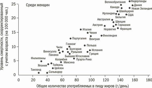 Рис. 14.2. Общее количество жиров в питании и смертность от рака молочной железы