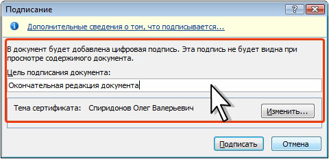 После того как в документе появилась цифровая подпись, он автоматически помечается как окончательный и доступен только для чтения. В документ можно добавить несколько невидимых цифровых подписей. Невидимую цифровую подпись можно добавить в документ, содержащий видимую цифровую подпись.