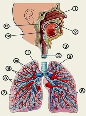 1 – носовая полость (cavitatis nasi); 2 - ротовая полость (cavitatis aris); 3 – гортань (larynx); 4 - трахея (trachea); 5 - левый главный бронх (sinistram main bronchus); 6 - левое легкое (pulmonis sinistri); 7 - правое легкое (pulmonis dextri); 8 - сегментарные бронхи (segmental bronchos); 9 - правые легочные артерии (ius pulmonalis arteria); 10 - правые легочные вены ((ius pulmonalis venas);
