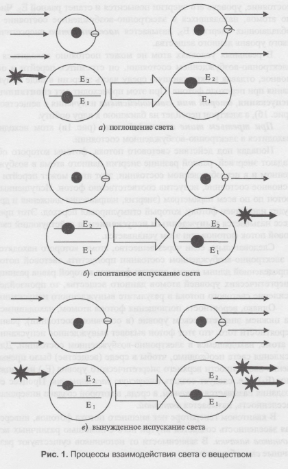 Квантовые переходы Испускание и поглощение света. Инвертированная активная среда В основе действия квантового генератора лежит открытый А. Эйнштейном тип взаимодействия электромагнитного излучения с веществом — вынужденное испускание. В соответствии с планетарной моделью Э. Резерфорда атомы представляют собой квантово-механические системы, состоящие из ядра и вращающихся вокруг него по определенным орбитам электронов. Начиная со второго элемента периодической системы Д. И. Менделеева, с атома гелия, на каждой заполненной электронной орбите (энергетическом уровне) имеется как минимум два электрона с противоположными спинами. На атомном уровне существует три типа взаимодействия электромагнитного излучения с веществом.