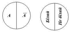 Відношення суперечності є між такими поняттями як „грамотний” і „неграмотний”, „електропровідний” і „неелектропровідний”, „справедлива війна” і „несправедлива війна” Відношення між поняттями, які знаходяться у відношенні суперечності зображено на рис. 5. Із схеми видно, що позитивне поняття А і негативне поняття не-А виключають весь обсяг родового поняття „війна”. Тому між двома суперечливими поняттями не може бути третього. Проміжного поняття. У відношенні супідрядності знаходяться два або більше неперехрещуванних понять, підпорядкованих родовому для них поняттю. Наприклад: „феодальний засіб виробництва”, „капіталістичний засіб виробництва”, „засіб виробництва”; „шахрай”, „крадій”, „розбійник”, „злочинець”.