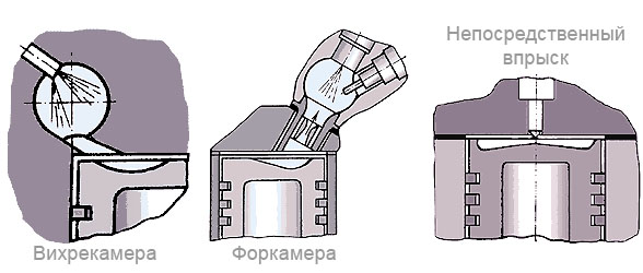 При форкамерном процессе топливо впрыскивается в специальную предварительную камеру, связанную с цилиндром несколькими небольшими каналами или отверстиями, ударяется об ее стенки и перемешивается с воздухом. Воспламенившись, смесь поступает в основную камеру сгорания, где и сгорает полностью. Сечение каналов подбирается так, чтобы при ходе поршня вверх (сжатие) и вниз (расширение) между цилиндром и форкамерой возникал большой перепад давления, вызывающий течение газов через отверстия с большой скоростью. Во время вихрекамерного процесса сгорание также начинается в специальной отдельной камере, только выполненной в виде полого шара. В период такта сжатия воздух по соединительному каналу поступает в предкамеру и интенсивно закручивается (образует вихрь) в ней. Впрыснутое в определенный момент топливо хорошо перемешивается с воздухом. Таким образом, при разделенной камере сгорания происходит как бы двухступенчатое сгорание топлива. Это снижает нагрузку на поршневую группу, а также делает звук работы двигателя более мягким. Недостатком дизельных двигателей с разделенной камерой сгорания являются: увеличение расхода топлива вследствие потерь из-за увеличенной поверхности камеры сгорания, больших потерь на перетекание воздушного заряда в дополнительную камеру и горящей смеси обратно в цилиндр. Кроме того, ухудшаются пусковые качества. Дизельные двигатели с неразделенной камерой называют также дизелями с непосредственным впрыском. Топливо впрыскивается непосредственно в цилиндр, камера сгорания выполнена в днище поршня. До недавнего времени непосредственный впрыск использовался на низкооборотистых дизелях большого объема (проще говоря, на грузовиках). Хотя такие двигатели экономичнее моторов с разделенными камерами сгорания, их применение на небольших дизелях сдерживалось трудностями организации процесса сгорания, а также повышенными шумом и вибрацией, особенно в режиме разгона. Сейчас благодаря повсеместному внедрению электронного управления процессом дозирования топлива удалось оптимизировать процесс сгорания топливной смеси в дизеле с неразделенной камерой сгорания и существенно снизить шумность. Новые дизельные двигатели разрабатываются только с непосредственным впрыском.