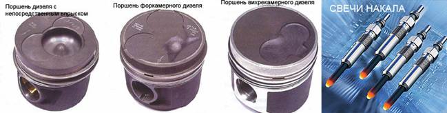 ОСОБЕННОСТИ Как уже отмечалось, конструкция дизельного двигателя подобна конструкции бензинового двигателя. Однако аналогичные детали у дизеля существенно усилены, чтобы воспринимать более высокие нагрузки - ведь степень сжатия у него намного выше (16-24 единиц против 9-11 у бензинового). Характерная деталь в конструкции дизелей — это поршень. Форма днища поршней у дизелей определяется типом камеры сгорания, поэтому по форме легко определить, какому двигателю принадлежит данный поршень. Во многих случаях днище поршня содержит в себе камеру сгорания. Днища поршней находятся выше верхней плоскости блока цилиндров, когда поршень находится в верхней точке своего хода. Так как воспламенение рабочей смеси осуществляется от сжатия, в дизелях отсутствует система зажигания, хотя свечи могут применяться и на дизеле. Но это не свечи зажигания, а свечи накаливания, которые предназначены для подогрева воздуха в камере сгорания при холодном пуске двигателя.