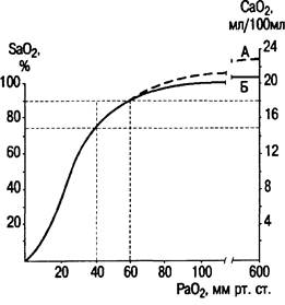 Рис. 3.1. Кривая диссоциации оксигемоглобина. Верхняя пунктирная линия (А) соответствует общему содержанию кислорода в артериальной крови при рН 7,4, РС02 = 40 мм рт.ст. и 37 °С. Непрерывная кривая (Б) соответствует количеству кислорода, связанного с гемоглобином. Токсичность кислорода. Во всех случаях кислородотерапии требуется осторожность. Токсичность кислорода подтверждается данными экспериментальных исследований и клинических наблюдений. Дыхание чистым кислородом в течение 3—5 дней может привести к гибели экспериментальных животных. Имеются указания на то, что высокие концентрации кислорода могут быть причиной РДСВ. Какие концентрации кислорода могут приводить к токсическому эффекту, не установлено. Безопасная FiО2 равна 0,21, т.е. соответствует концентрации кислорода в атмосферном воздухе. Следует полагать, что FiО2 0,4, используемая длительное время, также безопасна, а FiО2 0,5 возможно нетоксична, но ее назначение должно быть строго аргументировано. При этом, однако, нужно учитывать и возрастные факторы, поскольку с возрастом нормальные уровни РаО2 и SаO2 снижаются. Любого больного, получающего кислород в концентрации более 60 %, относят к группе высокого риска. Опасность гипероксигенации документируется тем, что небольшая часть кислорода (1—2 %) претерпевает одноэлектронное восстановление до воды, в процессе которого в качестве промежуточных продуктов образуются высокореактивные свободно-радикальные формы кислорода. Они могут вызывать окисление биомакромолекул и инициировать цепные процессы, способные приводить к повреждению мембраны клетки [супероксидный анионрадикал кислорода, пероксид кислорода (Н2О2), гидроксильный радикал (ОН)]. Липиды — основной компонент биологических мембран — представляют собой легко окисляющиеся соединения. Многие продукты ПОЛ (гидропероксиды, альдегиды, кетоны и др.) высокотоксичны и способны повреждать биологические мембраны. Защитные механизмы обеспечивают ферменты, ускоряющие превращение токсичных метаболитов в воду. Вторая линия защиты — фенольные антиоксиданты, серосодержащие соединения, каротиноиды и витамины А, С и Е. Витамин С может проявлять прооксидантную активность. Витамин Е (альфа-токоферола ацетат) относится к основным липофильным антиоксидантам [Марино П., 1998]. Методы оксигенотерапии. Кислородотерапию проводят с помощью носовых катетеров и масок, создающих определенные концентрации кислорода. Носовые катетеры. При использовании носовых канюль или катетеров поток кислорода от 1 до 6 л/мин создает во вдыхаемом воздухе его концентрацию, равную 24—44 %. Более высокие значения FiO2 достигаются при нормальной минутной вентиляции легких (5—6 л/мин). Если минутная вентиляция превышает поток кислорода, то избыток последнего будет сбрасываться в атмосферу, а FiO2 окажется сниженной. Носовые катетеры обычно хорошо переносятся больными. Их не следует применять при высокой ЧД и гиповентиляции. Носовые и лицевые маски. Маски снабжены клапанами, с помощью которых выдыхаемый воздух выводится в окружающую среду. Более удобны для пациента носовые маски. Последние имеют меньшее мертвое пространство и позволяют пациенту принимать пищу. Достоинством лицевых масок является их способность лучше справляться с непреднамеренной утечкой потока кислорода через рот, что является проблемой для мног