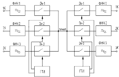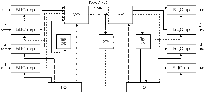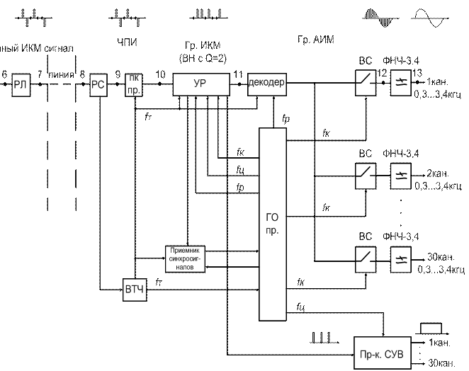 При асинхронном сопряжении возможны ситуации, когда частота записи в запоминающем устройстве больше частоты считывания (fз > fс), тогда память запоминающего устройства будет переполнена, а если наоборот, fз < fс, то память ЗУ будет пуста и в очередной момент считывать будет нечего. В первом случае часть информации пропадает, а во втором случае – появятся дополнительные временные позиции (нули), которые в исходном потоке отсутствуют. Чтобы не допустить возникновения этих нарушений, нужно обеспечить согласование скоростей. Если fз < fс, то производится положительное согласование скоростей (ПСС): при этом в считываемую последовательность вводится дополнительный балластный тактовый интервал, который на приеме должен быть изъят из передаваемого сигнала. Если fз > fс, то производится отрицательное согласование скоростей (ОСС): при этом из считываемой последовательности изымается один тактовый интервал, информация которого передается по специальному временному каналу и на приеме вводится в передаваемый поток на свое место. Устройство разделения (УР) на приемной станции обеспечивает распределение цифровых потоков по своим блокам цифровых сопряжений, где восстанавливаются первоначальные длительности импульсов и скорости передаваемого потока с помощью записи информационного потока в запоминающее устройство блока цифрового сопряжения приема и считывания его с тактовой частотой 2048 кГц. Выделитель тактовой частоты (ВТЧ) выделяет из линейного ИКМ-сигнала колебание тактовой частоты и подаёт его в ГО приёма, тем самым, обеспечивает равенство скоростей вторичного цифрового потока на передающей и приемной части станции. Приемник синхросигнала принимает цикловой синхросигнал и подаёт его в генераторное оборудование приёма, за счёт чего обеспечивается правильный порядок работы ключей на передающей и приёмной станциях.