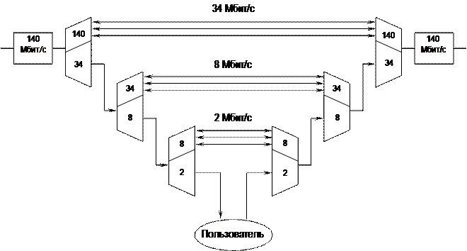 На каждом уровне ПЦИ вставляются (изымаются) выравнивающие биты, это приводит к тому, что, не производя полностью демультиплексирования, невозможно выделить в промежуточном пункте какой-либо составляющий поток из группового. Например, если (рисунок 1.8) из потока 140 Мбит/с нужно в промежуточном узле выделить один из 64-х составляющих его потоков по 2 Мбит/с, то необходимо поток 140 Мбит/с полностью демультиплексировать с прохождением промежуточных уровней 34 и 8 Мбит/с. После выделения требуемого потока 2 Мбит/с, все операции повторяются в обратном порядке.