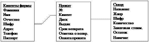 Если из таблицы Прокат известно, что клиент АИП22 взял диск Д001, то СУБД мгновенно найдет в таблице Клиенты фирмы все паспортные данные этого человека, а в таблице Склад все данные об этом диске.