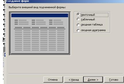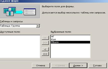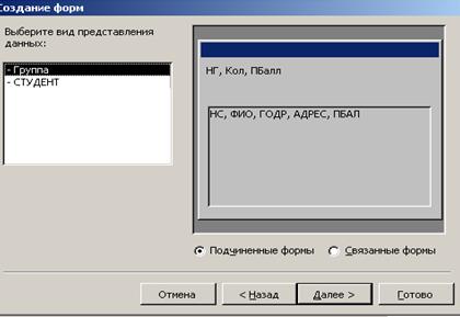 Замечание · Размещение реквизитов в основной части формы и подчиненной форме должно соответствовать входному документу “Список студентов группы” (рис.3.1). · Ключевое поле НГ не следует включать в подчиненную форму, т.к. НГ включен в основную часть формы. Основные этапы создания многотабличной формы представлены на рис.3.13-3.17