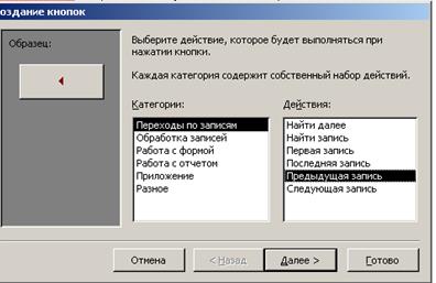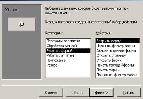 Нажмем на панели элементов ACCESS кнопку Мастер элементов, а затем Кнопка. После переноса кнопки курсором мыши в нужное место и вычерчивания ее рамки запустится мастер кнопок. Последовательность выполнения действий представлена на рис.3.18-3.22