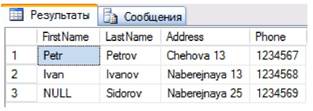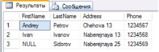 Значения могут быть помещены и удалены из полей тремя командами языка DML (Язык Манипулирования Данными): - insert (вставить), - update (изменить), - delete (удалить). Команда insert имеет свои особенности. - При указании значений конкретных полей вместо использования каких- либо значений можно применить ключевое слово DEFAULT. - Вставка пустой строки приводит к добавлению пробела, а не значения NULL. - Строки и даты задаются в апострофах. - Можно задавать NULL явно, а можно задавать DEFAULT. Например: insert into ClientInfo (FirstName, LastName, Address, Phone) values('Petr','Petrov','Chehova 13','1234567');Однократное выполнение этого запроса (нажатие клавиши F5 один раз) приводит к добавлению одной записи. Добавим еще несколько записей, изменяя значения values: insert into Clientlnfo (FirstName, LastName, Address, Phone) values('Ivan','Ivanov','Naberejnaya 13,,,1234568');insert into Clientlnfo (FirstName, LastName, Address, Phone) values(null,'Sidorov','Naberejnaya 25','1234569'); Извлечем все записи созданной таблицы (рис. 37): select * from Clientlnfo;
