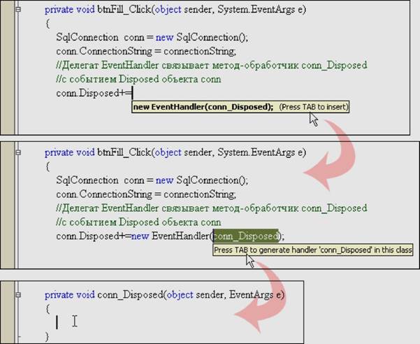 При вызове метода Dispose объекта Connection происходит освобождение занимаемых ресурсов и «сборка мусора». При этом неявно вызывается метод Close. Создадим новое Windows-приложение, работающее с базой данных BDTur_firmSQL.mdf. На форме разместим объект dataGridView со свойством Dock=Top, кнопку btnFill с надписью «Заполнить» справа под ним, и две метки (объекты типа Label). Свойству AutoSize каждой метки назначим значение False, свойству Dock второй метки (label2) значение Top, а свойству Dock первой (label1) None, и поместим ее под второй меткой слева, увеличив ее размеры (рис. 61). Подключаем пространство имен для работы с базой в файле Form1.cs: using System.Data.SqlClient; В классе формы создаем строки connectionString и commandText: string connectionString = @"Data Source=.\SQLEXPRESS; AttachDbFilename=" + Объекты ADO будем создавать в обработчике события Click кнопки «Заполнить»: private void btnFill_Click(object sender, System.EventArgs e) { Для создания методов-обработчиков дважды нажимаем клавишу TAB при вводе соответствующей строки как на рис. 60. В методе conn_Disposed просто будем выводить текстовое сообщение в надпись label2: private void conn_Disposed(object sender, EventArgs e) { При необходимости в этом методе могут быть определены соответствующие события. В методе conn_StateChange будем получать информацию о текущем и исходном состояниях соединения: private void conn_StateChange(object sender, StateChangeEventArgs e) { Запускаем приложение. До открытия соединения состояние объекта conn было закрытым (Closed). В момент открытия текущим состоянием становится Open, а предыдущим - Closed. Этому соответствуют первые две строки, выведенные в надпись (рис. 61). После закрытия соединения (вызова метода Dispose) текущим состоянием становится закрытое (Closed), а предыдущим - открытое (Open). Этому соответствуют последние две строки, выводимые в надпись.